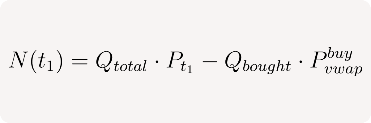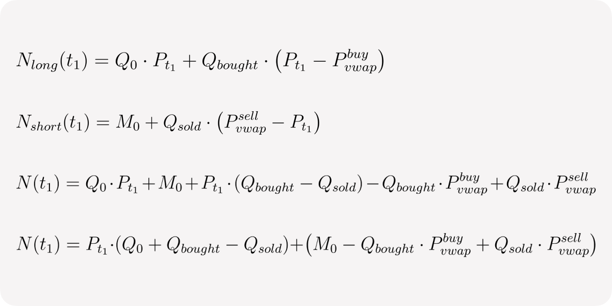 First two formulas show that both long Net position and short Net position consist of initial margin (first term) and the PnL (second term). Slightly reorganizing the terms for the total net position we can observe that net position tracks current balances value of both quote and base assets. Written in this form it shows us that the balanced system is when Qbought = Qsold and Pvwap buy = Pvwap sell