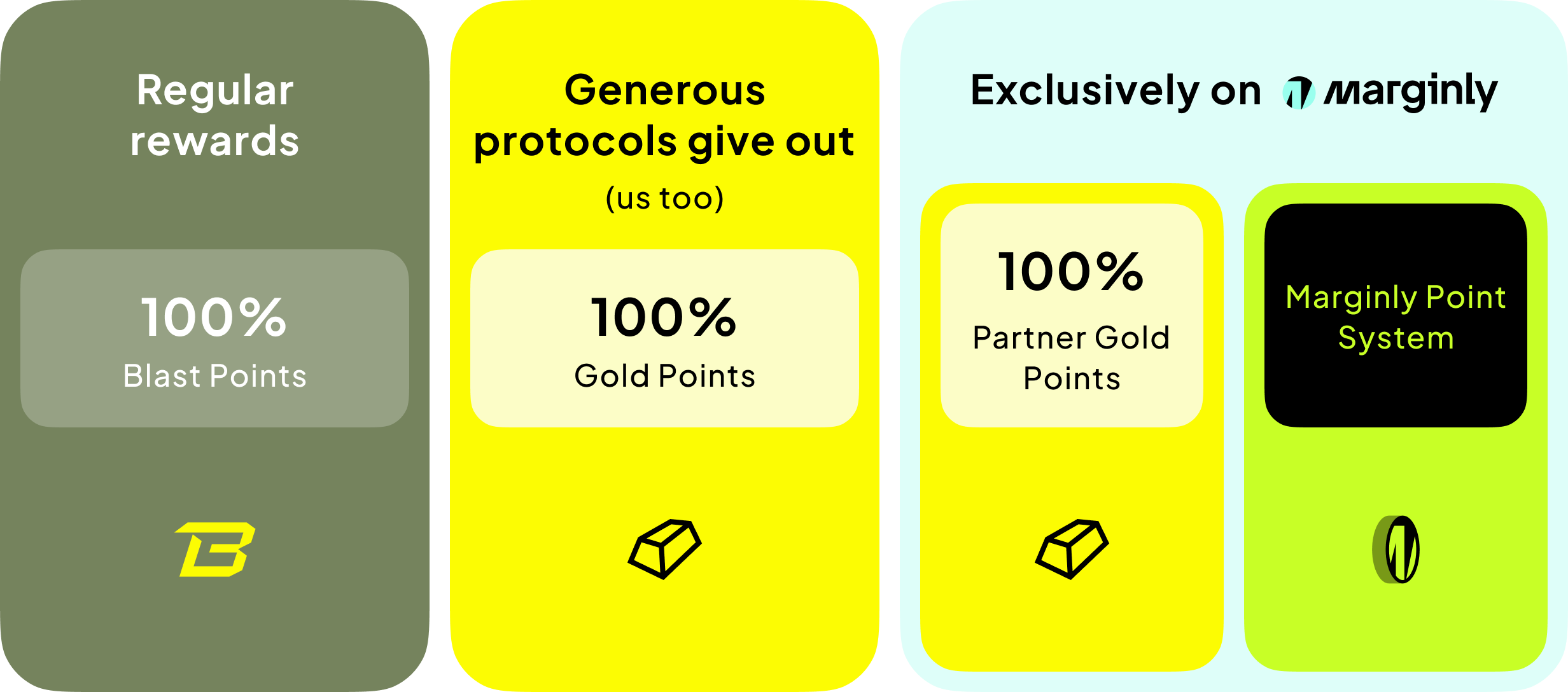 Currently, Marginly allows you to farm three yield-bearing assets - thus allowing users to capture native Blast yields, in addition to earning Blast and Marginly points: