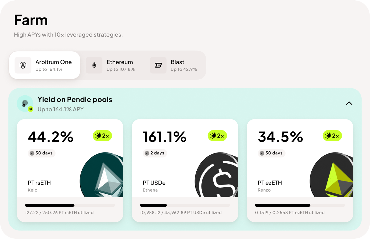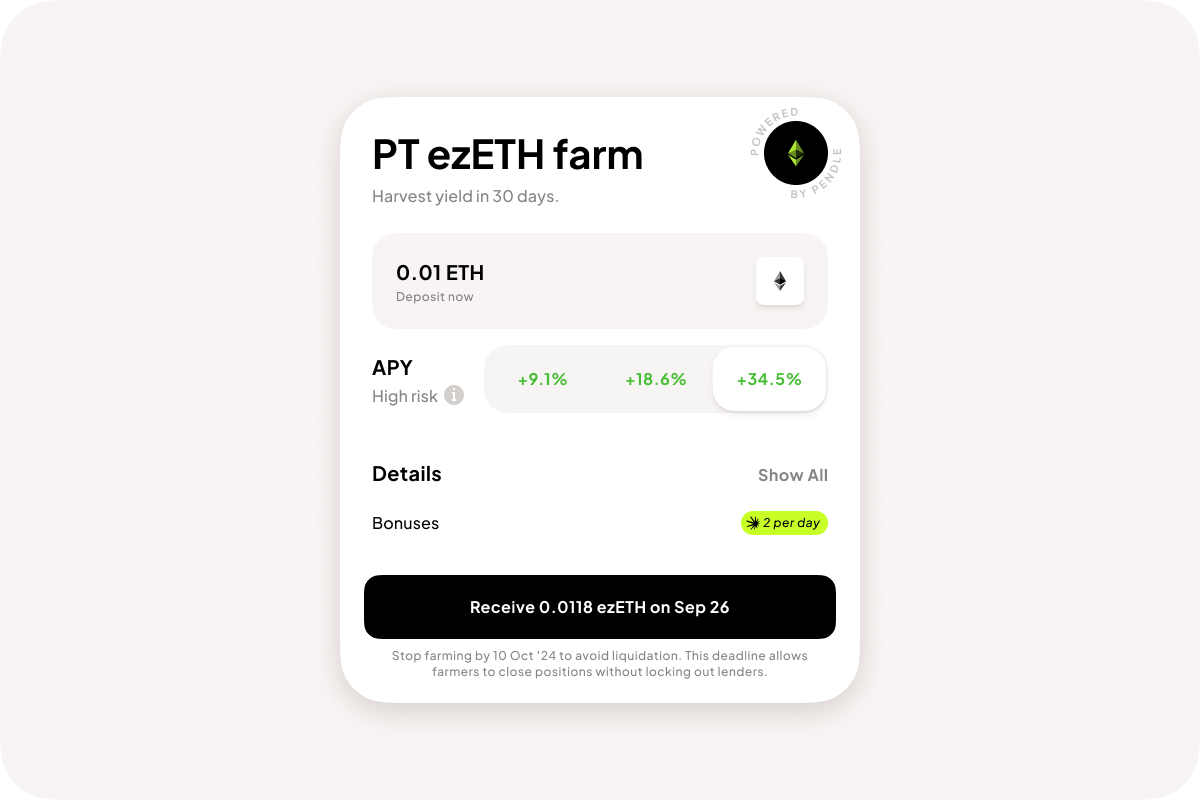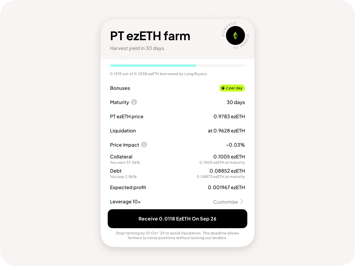 - For best results, farm until maturity to lock in the yield offered by Pendle PT tokens. Remember, farming by borrowing ETH instead of the LRT introduces additional risks related to LRT price vs ETH price fluctuations.