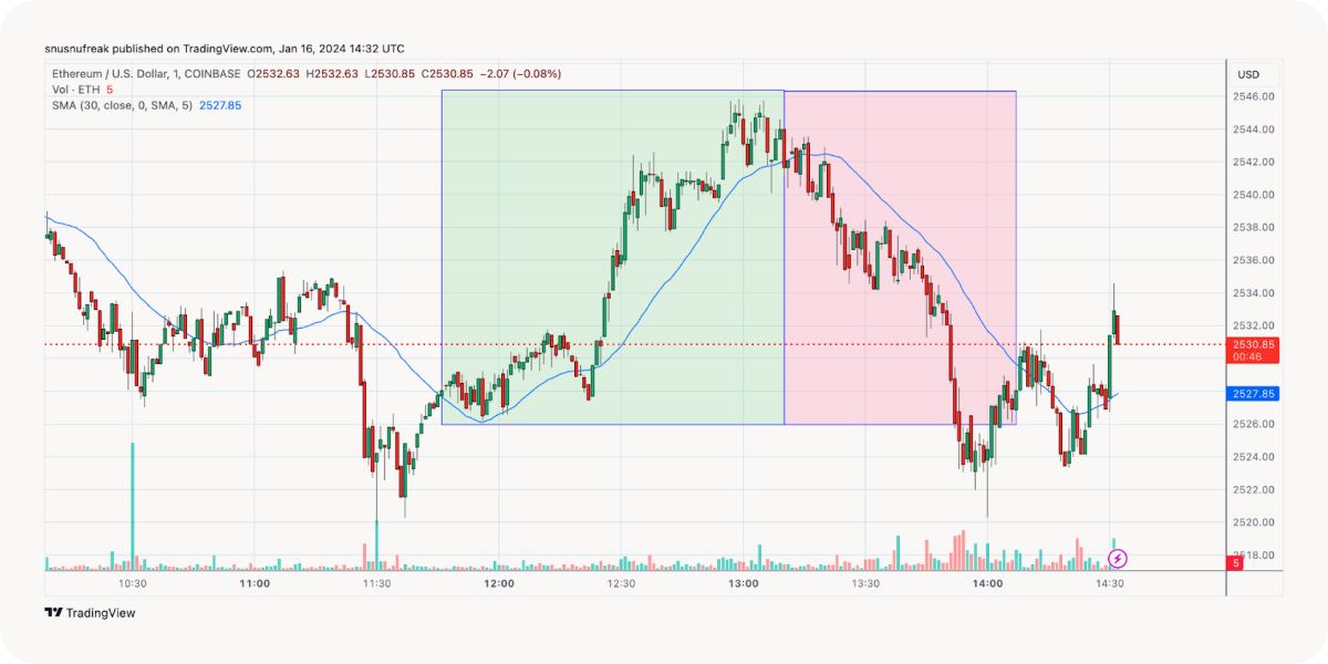 The common length for the TWAP average we use for Marginly pools is 30 minutes. TWAP is basically the average price for the last 30 minutes. Any type of averaging will lag the current market price and sometimes substantially. Any trader who has seen a price chart with the moving average overlay should know this. There are basically 2 options, price is either above or below the moving average: