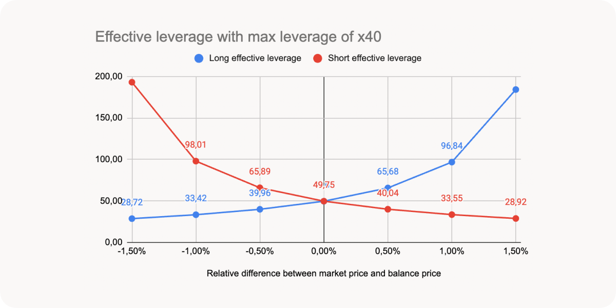 Effective position leverage which takes into account both the price discrepancies and fees should not exceed x100: it turns out that the maximum we can achieve is x40. With this leverage the ~ -/+ 1% deviation of market price relative to balance price, taking into account all the fees, won't exceed x100: